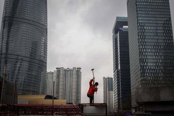 2015年3月,上海陆家嘴,一位工人在工地上施工。 寇聪 澎湃资料图