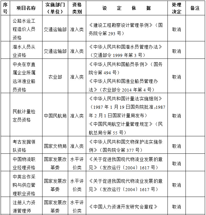经研究论证,国务院决定取消61项职业资格许可和认定事项,现予公布。同时,建议取消1项依据有关法律设立的职业资格许可和认定事项,国务院将依照法定程序提请全国人民代表大会常务委员会修订相关法律规定。