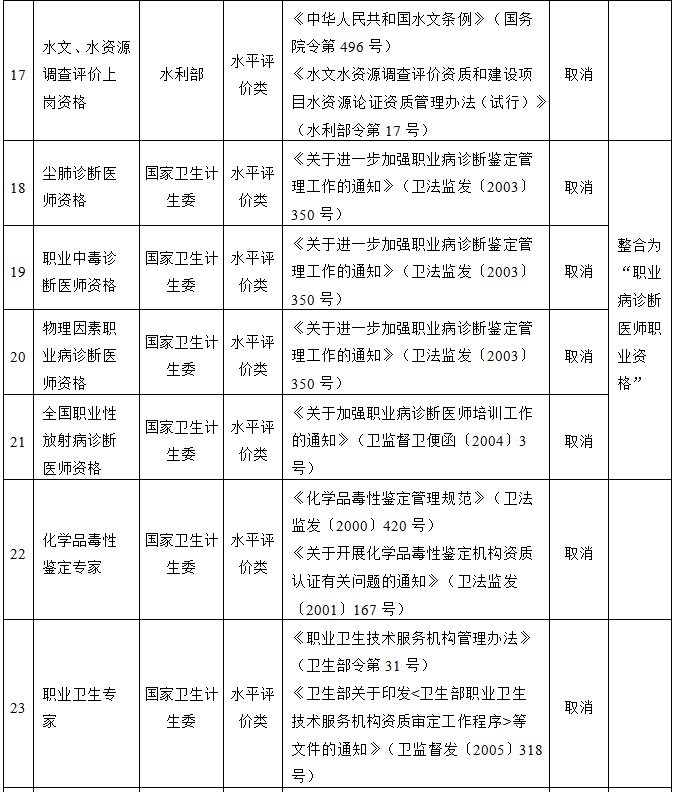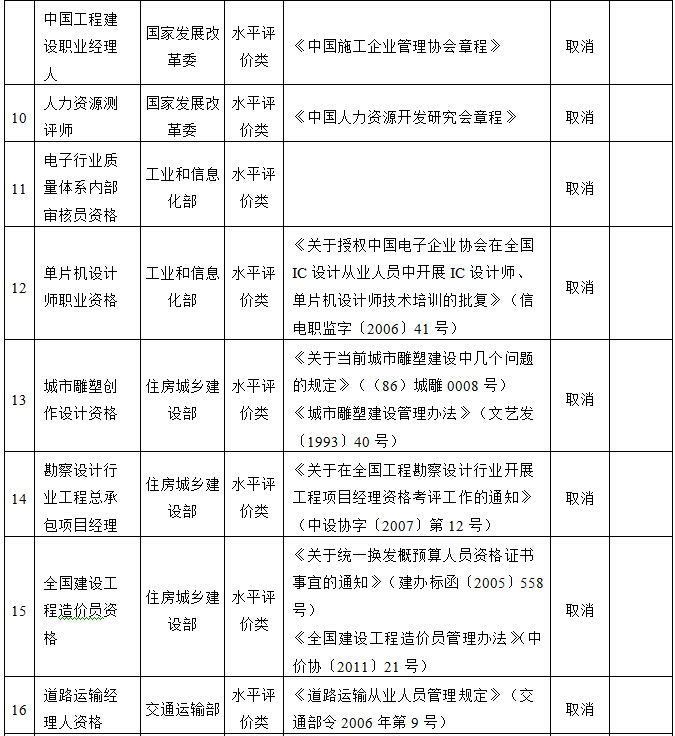 一、取消的专业技术人员职业资格许可和认定事项(共计43项,其中准入类5项,水平评价类38项)