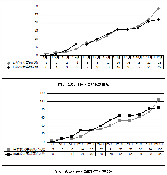 2015年,全国共发生房屋市政工程生产安全较大事故22起、死亡85人,比去年同期事故起数减少7起、死亡人数减少20人(见图3、图4),同比分别下降24.14%和19.05%,未发生重大及以上事故。