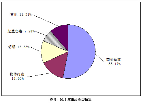 2015年,房屋市政工程生产安全事故按照类型划分,高处坠落事故235起,占总数的53.17%;物体打击事故66起,占总数的14.93%;坍塌事故59起,占总数的13.35%;起重伤害事故32起,占总数的7.24%;机械伤害、触电、车辆伤害、中毒和窒息等其他事故50起,占总数的11.31%(见图5)。