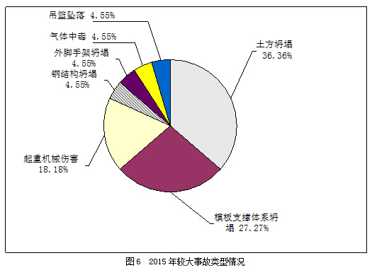 2015年,共发生22起较大事故,其中土方坍塌事故8起,死亡25人,分别占较大事故总数的36.36%和29.41%;模板支撑体系坍塌事故6起,死亡32人,分别占较大事故总数的27.27%和37.65%;起重机械伤害事故4起,死亡15人,分别占较大事故总数的18.18%和17.65%;钢结构坍塌事故1起,死亡4人,分别占较大事故总数的4.55%和4.71%;外脚手架坍塌事故1起,死亡3人,分别占较大事故总数的4.55%和3.53%;气体中毒事故1起,死亡3人,分别占较大事故总数的4.55%和3.53%;吊篮坠落事故1起,死亡3人,分别占较大事故总数的4.55%和3.53%(见图6)。