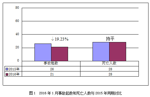 2016年1月,全国共发生房屋市政工程生产安全事故21起、死亡28人,比去年同期事故起数减少5起,同比下降19.23%;死亡人数持平(见图1)。