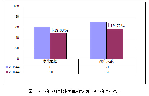 2016年5月,全国共发生房屋市政工程生产安全事故50起、死亡57人,比去年同期事故起数减少11起、死亡人数减少14人,同比分别下降18.03%和19.72%(见图1)。