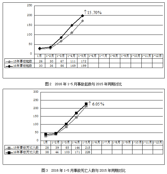 2016年1-5月,全国共发生房屋市政工程生产安全事故199起、死亡228人,比去年同期事故起数增加27起,死亡人数增加13人,同比分别上升15.70%和6.05%(见图2、图3)。