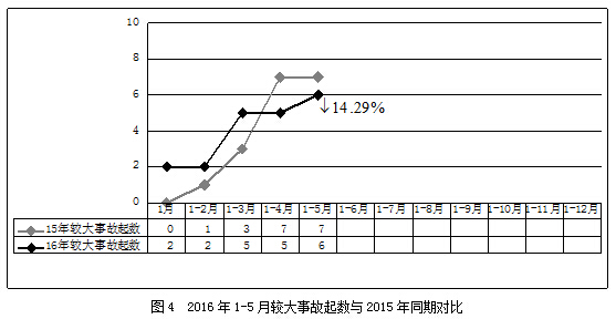 2016年1-5月,按照《住房城乡建设质量安全事故和其他重大突发事件督办处理办法》(建法〔2015〕37号)和《房屋市政工程生产安全和质量事故查处督办暂行办法》(建质〔2011〕66号)规定,2015年发生的四川广元“11·18”模板支撑体系坍塌事故及2016年发生的四川资阳“1·19”外脚手架坍塌事故、河北唐山“1·30”模板支撑体系坍塌事故、上海虹口3·25”起重伤害事故等4起较大事故发生所在地住房城乡建设主管部门尚未报送较大事故调查报告、政府批复及处罚文件等材料。