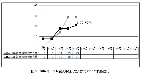 2016年1-5月,全国共发生房屋市政工程生产安全较大事故6起、死亡21人,比去年同期事故起数减少1起、死亡人数减少8人,同比分别下降14.29%和27.59%(见图4、图5)。