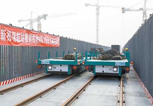 近日,北京新机场航站楼跨越式钢栈桥通车暨暑期慰问建设者仪式举行。在仪式上,北京城建集团相关负责人介绍说,该工程设计安装了两座跨越式钢栈桥,每座栈桥铺设4条铁轨,配备8台“小火车”,中间设置两处变轨,每台“小火车”最大载重30吨。刚刚投入使用的“小火车”,不仅有效解决了平面尺寸超长超宽建筑的材料运输难题,功效也提高了3~4倍。据了解,这是国内建筑工程首次使用“小火车”。