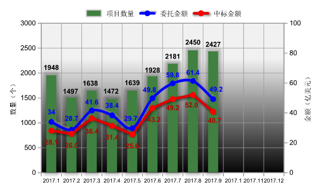 据统计,2017年1-9月全国机电产品国际招标累计中标金额达332.7亿美元,同比增长29.2%;累计委托金额392.6亿美元,同比增长14.2%;累计中标项目数量17180个,同比增长24.1%。