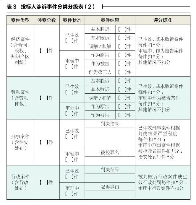 评标中应当将企业涉诉案件分类、分级设置权重,用不同的评分标准评价投标人,不仅招标人能够得到准确的涉诉信息,评估投标人的各类风险,同时投标人也能预先评判该项得分,不盲目参与投标,见表3。