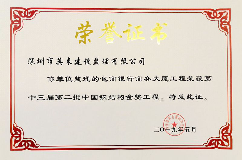 近日,深圳市英来建设监理有限公司收到由中国建筑金属结构协会颁发的“第十三届第二批中国钢结构金奖工程”证书,公司监理的包商银行商务大厦工程获此殊荣