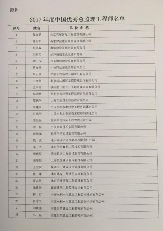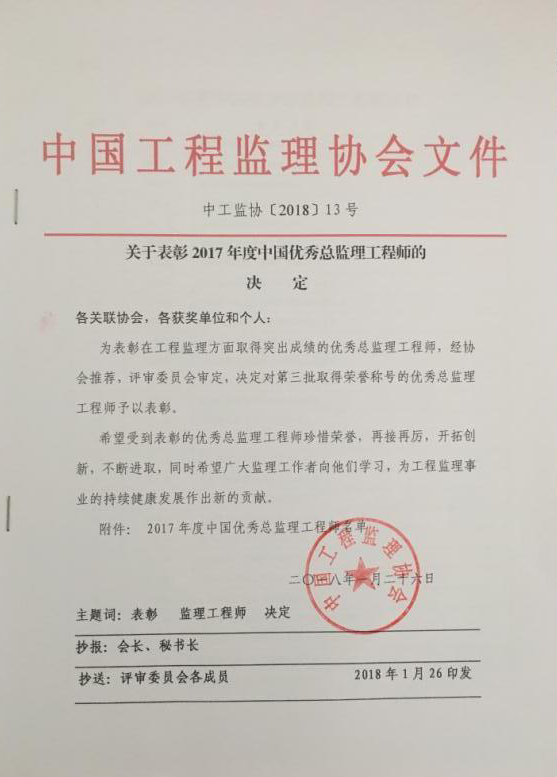 关于表彰2017年度中国优秀总监理工程师的决定