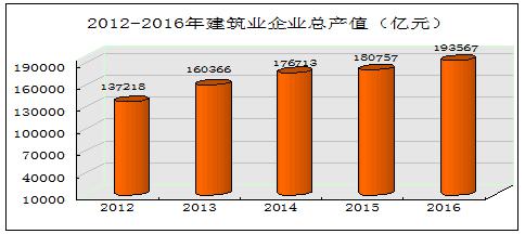 (二)建筑队伍持续壮大,行业实力显著增强。2016年全国建筑业企业年末从业人员数达5185万人,是2012年的1.22倍。2013-2016年,年均增长5.0%。建筑业资产规模迅速扩大,2016年资产总计18.2万亿元,是2012年的1.63倍,年均增长13.1%,行业综合实力显著增强。