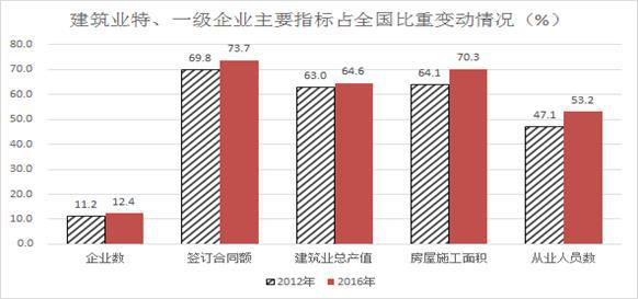 (二)建筑业产业集中度进一步提高。十八大以来,我国建筑行业资质结构渐趋优化,高资质等级企业市场占有率不断提升,产业集中度进一步提高。2016年,我国特、一级建筑业企业数量较2012年增长21.1%,占全部建筑业企业个数比重为12.4%,比2012年提高了1.2个百分点。特、一级建筑业企业签订合同额、完成建筑业总产值、房屋施工面积和从业人员数占全行业的比重分别达到73.7%、64.6%、70.3%和53.2%,比2012年分别提高了3.9、1.6、6.2和6.1个百分点,具有较高资质等级的建筑业企业对全行业的影响力进一步增强。