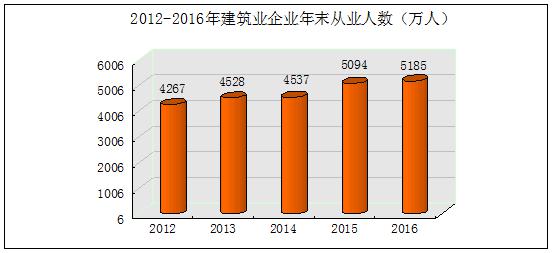 (二)吸纳劳动力数量稳定增长,稳就业作用更加突出。2013-2016年,全国建筑业企业年末从业人数逐年增长,年均增加230万人,2016年达到5185万人,比2012年增加918万人。2016年,建筑业从业人员占全国就业人员的比重达6.7%,较2012年提高了1.1个百分点。在近年来经济下行、全社会就业压力较大的大背景下,建筑业吸纳富余劳动力,缓解全社会就业压力的效果明显,作用更加突出。